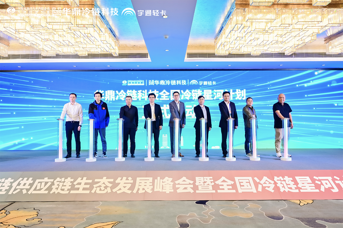 在與會嘉賓的共同見證下,河南省物流與采購聯(lián)合會冷鏈行業(yè)分會秘書長郭鵬、華鼎冷鏈科技CEO王君、宇通輕卡總經(jīng)理彭浩、華鼎冷鏈科技副總經(jīng)理洪德智等九位來自協(xié)會與企業(yè)的代表共同啟動了“星河計劃”。