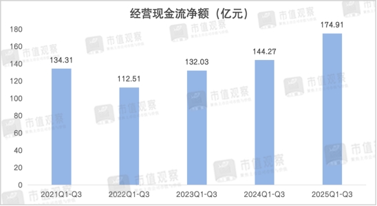 前三季度,更能體現(xiàn)利潤(rùn)含金量的經(jīng)營(yíng)現(xiàn)金流凈額達(dá)到174.91億元,亦創(chuàng)歷史新高,同比增加21.2%。