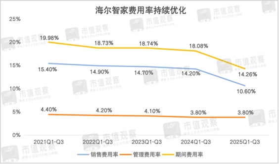 此前,一些觀點(diǎn)認(rèn)為海爾智家費(fèi)率高。而梳理過往財(cái)報(bào)發(fā)現(xiàn),過去五年,海爾智家銷售和管理費(fèi)用率持續(xù)優(yōu)化,經(jīng)營(yíng)效率顯著提升,期間(三費(fèi))費(fèi)用率持續(xù)下滑,已累計(jì)優(yōu)化了5.72個(gè)百分點(diǎn)。
